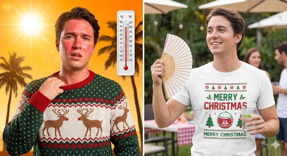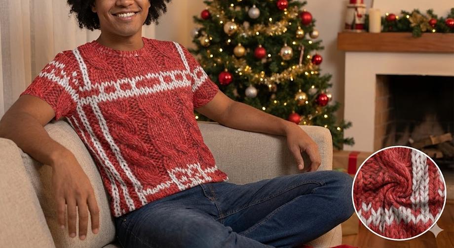 ไอเดียยอดฮิตสำหรับคนขี้ร้อน คือการเลือก เสื้อคริสต์มาสพิมพ์ลาย ที่พิมพ์ลายเลียนแบบถักไหมพรม (Knitted Pattern) มองไกลๆ เหมือนเสื้อกันหนาว แต่จริงๆ คือเสื้อยืดบนผ้าฝ้ายที่ใส่สบายสุดๆ