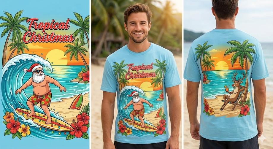 ฉีกกฎเดิมๆ ด้วยธีม Tropical เช่น ซานต้าใส่แว่นกันแดด หรือกวางเรนเดียร์ริมทะเล กราฟิกแบบนี้ทำให้ เสื้อคริสต์มาสพิมพ์ลาย ของคุณดูเข้ากับอากาศเมืองไทยและดูชิลล์กว่าใคร