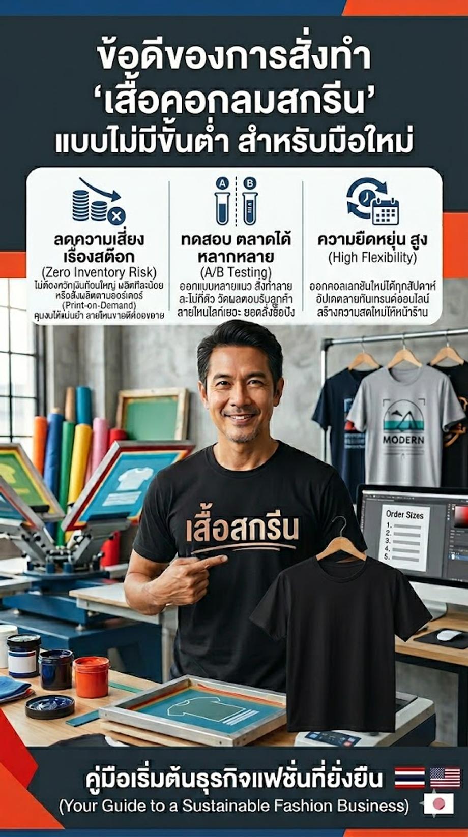 ลดความเสี่ยง เรื่องสต็อก (Zero Inventory Risk): คุณไม่จำเป็น ต้องควักเงิน ก้อนใหญ่ มาผลิต เสื้อคอกลมสกรีน เก็บไว้ เป็นร้อยๆ ตัว โดยที่ ยังไม่รู้ว่า ลายไหน จะขายดี การสั่งผลิต ตามออร์เดอร์ (Print-on-Demand) ช่วยให้คุณ คุมงบประมาณ ได้อย่าง แม่นยำ