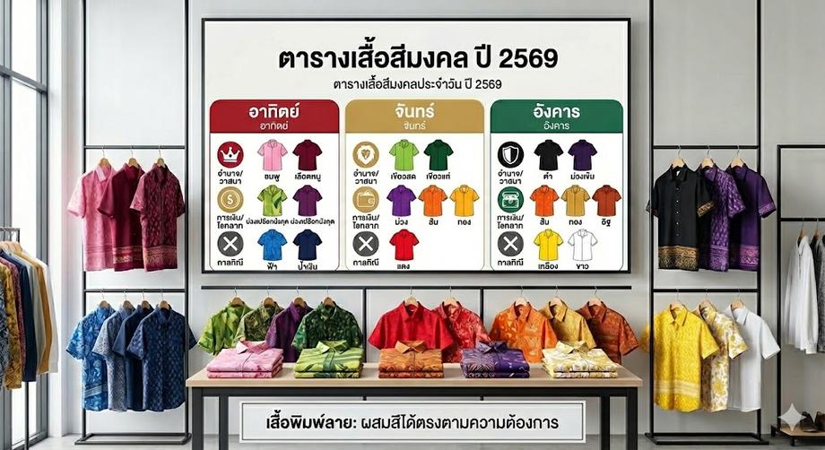 นี่คือโพยสีเสื้อมงคลประจำปี 2569 ที่คัดมาแล้วว่าใช้ได้จริง ซึ่งหากคุณต้องการสีที่เป๊ะตามตารางนี้ การสั่งทำ เสื้อพิมพ์ลาย จะตอบโจทย์ที่สุด เพราะสามารถผสมสีได้ตรงตามความต้องการ