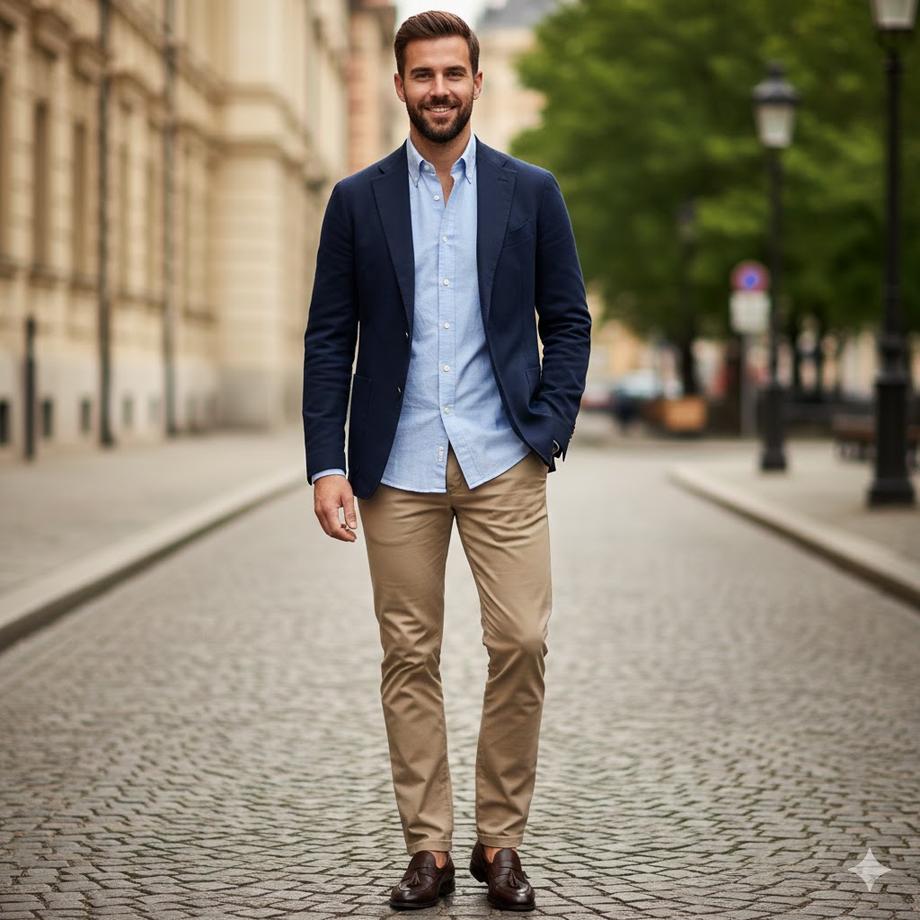 กางเกง : กางเกงชิโน่ (Chinos) สีเบจ สีเขียวทหาร หรือสีกรมท่า ทรงขาเรียว (Tapered)