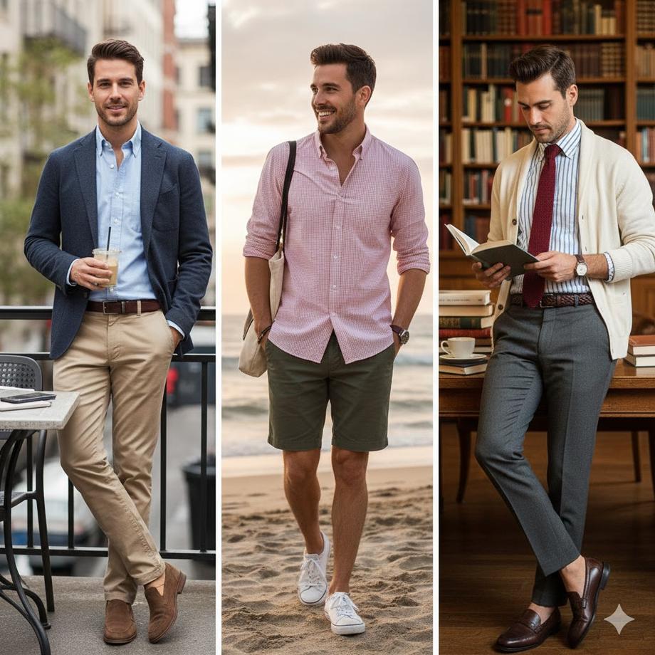 เสื้อเชิ๊ต : เสื้อเชิ๊ต Oxford สีชมพูอ่อน หรือลายตารางเล็ก ๆ (Gingham) พับแขนเสื้อเชิ๊ต ขึ้นมาเหนือข้อศอก