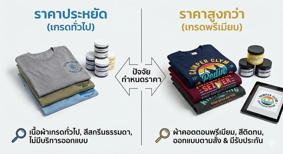 เมื่อคุณสอบถามราคาจากร้านรับทำเสื้อหลายแห่ง คุณอาจพบว่าราคาต่อตัวมีความแตกต่างกันตั้งแต่หลักสิบไปจนถึงหลักร้อย สาเหตุหลักมาจากการผลิต เสื้อยืดสกรีน นั้นไม่ได้มีราคากลางที่ตายตัวเหมือนสินค้าสำเร็จรูป แต่เป็นงานสั่งทำ (Made to Order) ที่มีต้นทุนแปรผันตามสเปกของงาน
