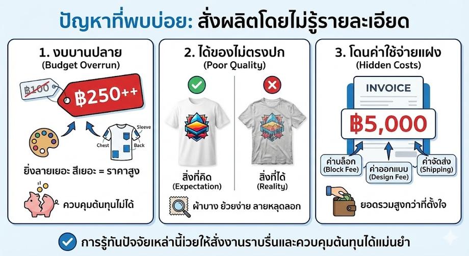 หนึ่งในปัญหาใหญ่ (Pain Point) ของลูกค้าคือการตั้งงบประมาณผิดพลาด เพราะขาดความเข้าใจในกระบวนการผลิตเสื้อนำไปสู่ปัญหาต่างๆ ดังนี้