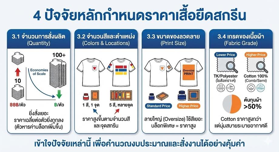 เพื่อให้คุณคำนวณงบประมาณเบื้องต้นได้ถูกต้อง มาดู 4 ปัจจัยหลักที่โรงงานใช้กำหนดราคา เสื้อยืดสกรีน กันครับ