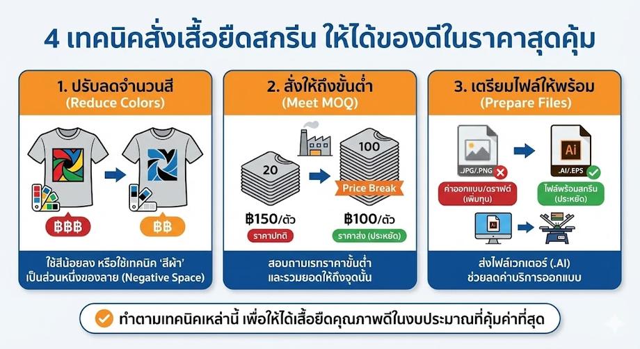 สั่งให้ถึงขั้นต่ำ : สอบถามโรงงานว่าเรทราคา เสื้อยืดสกรีน จะลดลงเมื่อสั่งกี่ตัว (Price Break) และพยายามรวมยอดให้ถึงจุดนั้น