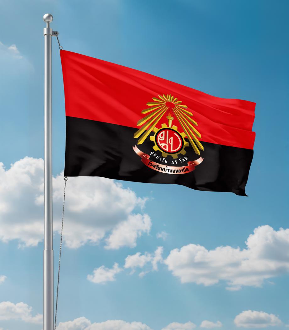 งานจบโปรเฟสชันนัล – เฮ็มริม + ห่วงโลหะ/สอดเสา/มุมเสริมแรง ตามตำแหน่งติดตั้งจริง เพื่อยืดอายุธง